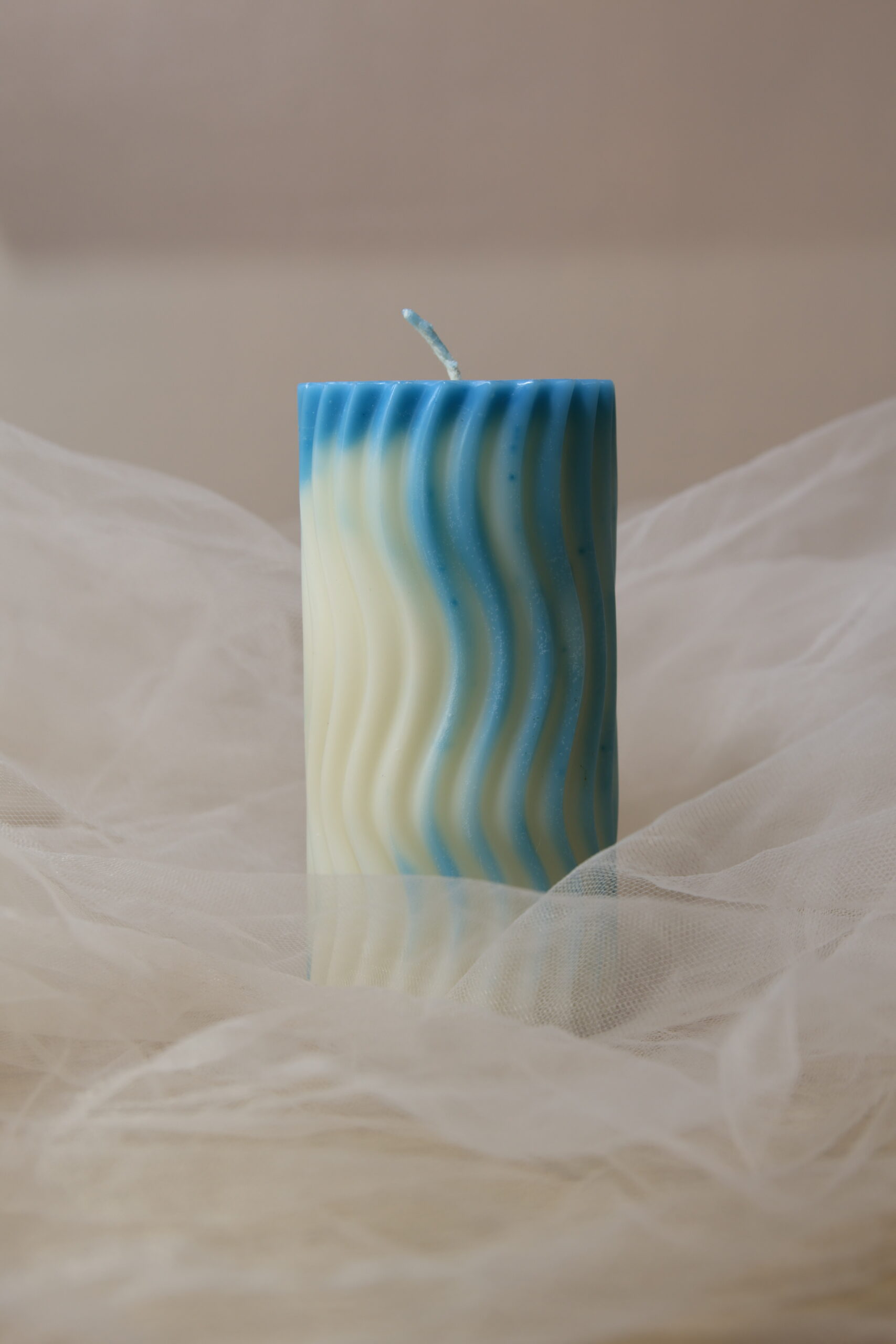 Bougie à la forme ondulée, évoquant le mouvement de la mer. Élégante et apaisante.